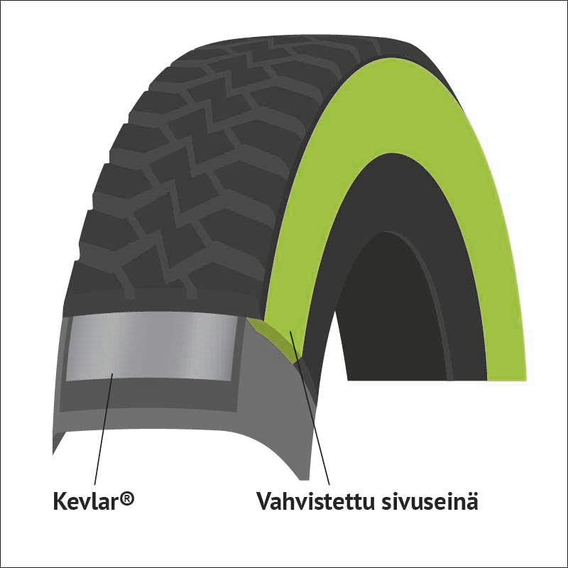 Vuosien pinnoitustyön kokemuksella olemme tutkineet tuhansia pinnoitukseen tulevia rengasrunkoja ja näiden havaintojen perusteella lähdimme kehittämään uutta tuotetta, joka antaa paremman suojan pistoilta, iskuilta ja viilloilta. KA-R1™:n erinomainen pistosuoja saavutetaan kulutuspinnan alla käytetystä aramidikuitu- eli Kevlar® -uranpohjavahvikkeiden sekä vahvistetun sivuseinän ansiosta. Kevlar® on jopa viisi kertaa vahvempi, kuin teräs, joten se tarjoaa huomattavasti paremman suojan teräviltä metalliesineilta ja kiveniskemiltä.