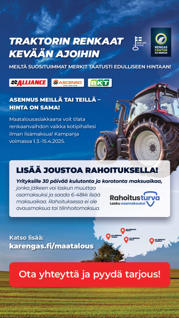 Kevät on täällä ja on aika varmistaa, että traktorisi on valmis kauden haasteisiin! KA-Rengas ja Pinnoittamo.fi tarjoaa sinulle laajan valikoiman suosituimpia traktorin rengasmerkkejä, kuten Alliance, Ascenso ja BKT, taatusti edulliseen hintaan. Olipa tarpeesi uusiin renkaisiin minkälaiset tahansa, meiltä löydät varmasti sopivat ratkaisut!
