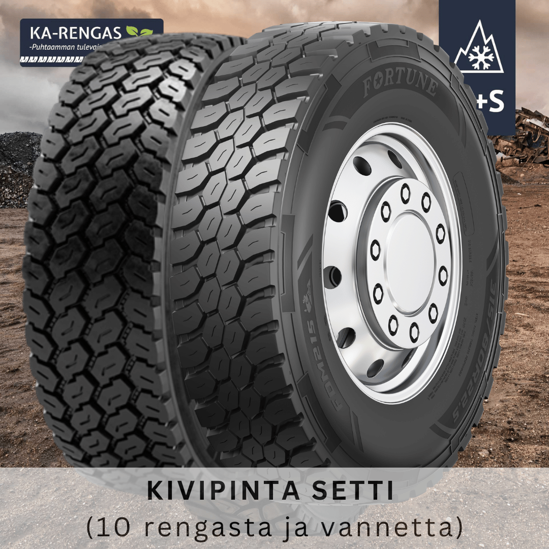 - 8 kpl 315/80 Fortune FDM215 -kivipintaisia renkaita, jotka on asennettu uusille SRW-vanteille. Fortune FDM215 -renkaat on suunniteltu erityisesti vetäville akseleille, ja ne tarjoavat erinomaisen pidon sekä maantiellä että maastossa. Jykevä kulutuspinta ja ainutlaatuinen keskiura takaavat tehokkaan itsepuhdistuvuuden ja tasaisen kulumisen.